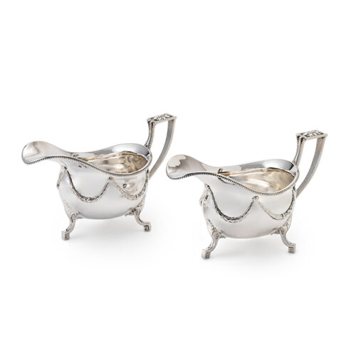 PAIR OF DUTCH SILVER SAUCE BOATS view DUTCH SILVER SOUP LADLE view DUTCH SILVER TABLEBELL view DUTCH SILVER COFFEE URN view Pair of Dutch silver candlesticks view Two-piece silver pumkin service view Parcel-gilt silver patron sign view