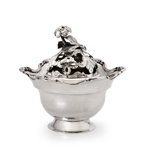 A Dutch silver potpourri view PAIR OF SILVER SUGAR CASTERS view PAIR OF DUTCH SILVER CANDLESTICKS view PAIR OF DUTCH SILVER SAUCE BOATS view DUTCH SILVER SOUP LADLE view DUTCH SILVER TABLEBELL view DUTCH SILVER COFFEE URN view Pair of Dutch silver candlesticks view Two-piece silver pumkin service view Parcel-gilt silver patron sign view