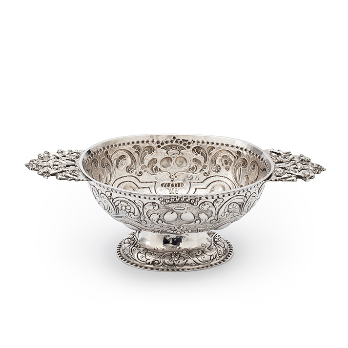 In literature on antique silver only this bowl by this master is recorded. It is possible that more objects by this anonymous master have been preserved. Unfortunately, they have not been not recorded in literature. Voet Jr. stated in 1932 that the date letter had been misstruck, but this is not correct. It is the lion that has been misstruck. in 1932 Voet Jr. recorded as provenance, Mrs. Bijleveld-van der Vliet. Bertha Johanna Wilhelmina van der Vliet (1852-1926) was married to Emil Pieter Hendrik Marie Bijleveld. From 1885 the couple lived in the well-known Belvedere estate in Overveen. Belvedere came into her possession by inheritance. After the childless death of Willem Borski III (1834-1884), in 1884, Belvedere passed to his eldest sister Mrs. D. van der Vliet-Borski. From 1885 her daughter B.J.W. Bijleveld-Van der Vliet lived in Belvedere.