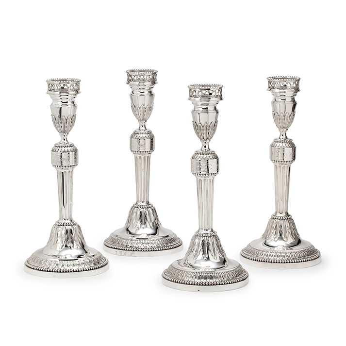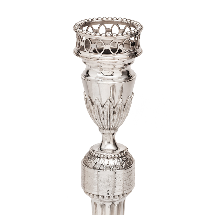 Each candlestick on a circular high-domed base with stiff leaves and a beaded and stiff leaf border, rising to a tapering fluted stem with beaded knob, engraved with a band of flower heads, surmounted by an urn-shaped socket applied with stiff leaves; detachable nozzle with gallery pierced with ovals and beaded border. Fully marked on the underside of the bases. Also struck with the control mark ‘a crowned O’ for 1807.