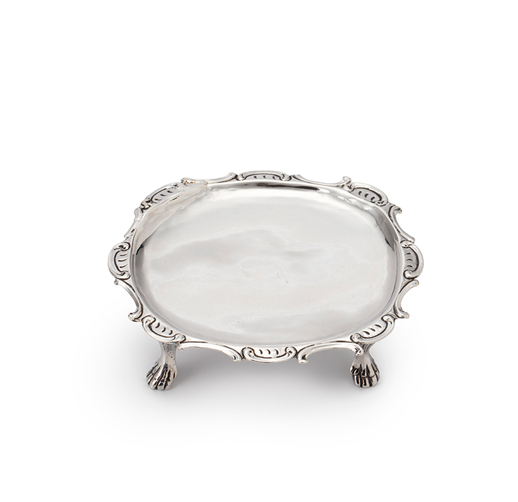 The pattipan is raised on four claw supports and has a shaped border with scrolls. Fully marked at the reverse.