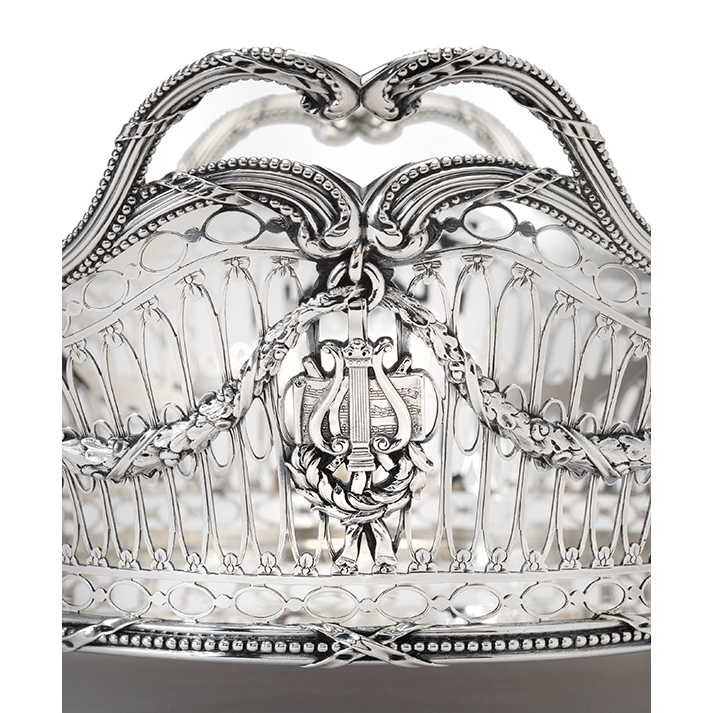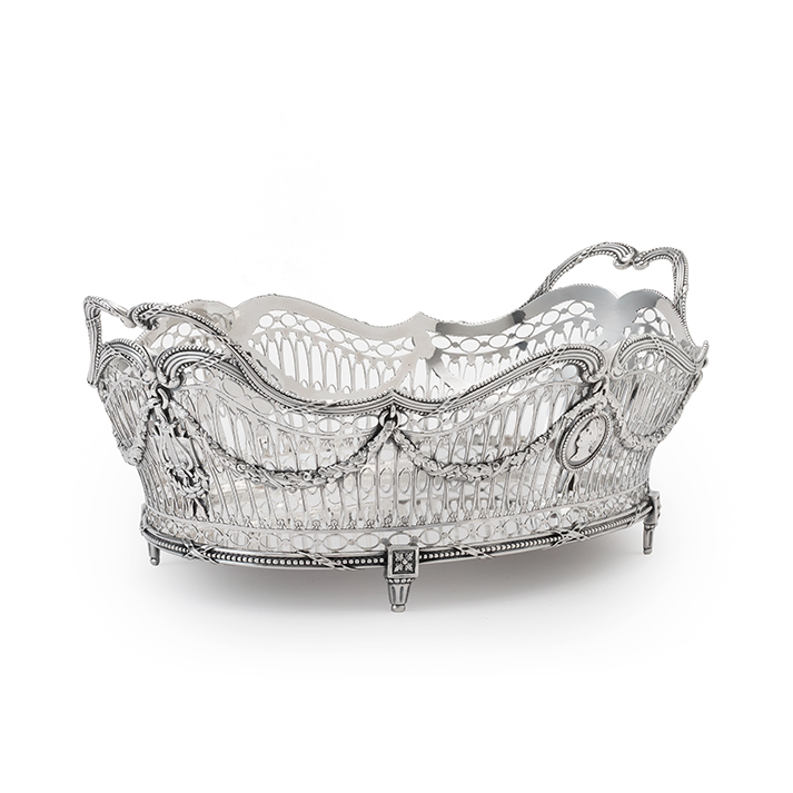 The sides of the large oval silver basket with plain bottom are pierces with elongated ovals. The upper and lower bands , placed between pearl rims, are also pierced with horizontal ovals. The sides are applied with foliate swags, suspending a medallion with a classical bust. On the short sides, under the handles, a lyre-shaped ornament with a sheet of music is applied. The handles on both sides are openwork with leaf ornament and trimmed with pearl rims, merging into the similar curved upper rim. Fully marked at the reverse of the basket and displaying an assay stripe.