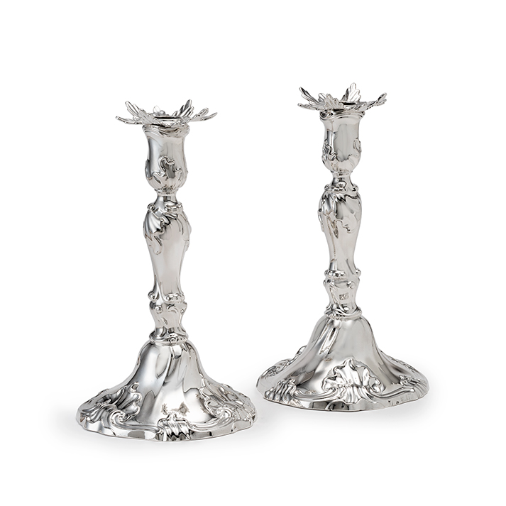 The cast candlesticks are decorated with swirling flutes and shell and leaf motifs. The detachable sconces are formed by protruding leaves. Fully marked on the foot rim and displaying an assay stripe on the reverse of the foot.