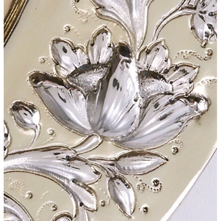 Een paar mooie voorbeelden van deze bloemstijl in de collectie Jacob J,. Roosjen, SRI® zijn een groot diabolo-vormig zilveren zoutvat en een verguld zilveren sierschotel.